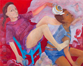 PHILEMONA WILLIAMSON PAINTS PRETEEN FEMALES who float in pairs across canvas with the lightness of schoolgirls at a moon-struck tea party. There is a charm, even a sweetness, to them that sets them far afield from the surrealist frisson to which the exhibition lays claim. Figures drift and turn in gravity-free spaces, more like untethered astronauts than Chagall’s airborne couples. Topsy-turvy cupcakes, hovering goblets, stylized flowers and buoyant oddments provide local color for dreamy narratives that waft over the surface with the insubstantiality of light fiction. Continue Reading