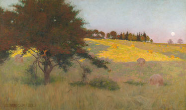 Arthur Wesley Dow, deeply engaged by Asian aesthetics and the tenets of the Arts & Crafts movement, is wonderfully represented with two very different natural scenes. “Moon Through the Trees” (c. 1910) epitomizes the evocative power of subdued light on diffuse contours, that refined spatial ambiguity inherited from Aestheticism. It carries the warm, vespertine tones used earlier byThéodore Rousseau in scenes of Fontainebleau Forest. “Study for a Field Kerlaouen” (c. 1885), a much-reproduced Breton landscape, has the clarity and lively coloration of a motif begun in the open air. Both are so lovely it does not matter what tag is placed on them.