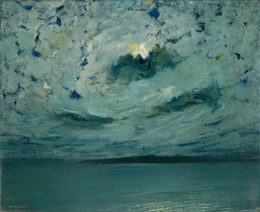 Henry Prellwitz’s Swirling Clouds in the Moonlight (c. 1890s) typifies the splendid nocturnes that were his forté. This captivating view of a turbulent sky over Peconic Bay embodies the fluctuating Tonalist straddle—of nineteenth century academicism on one hand and modern motives on the other—tipping it decidedly toward the modern.