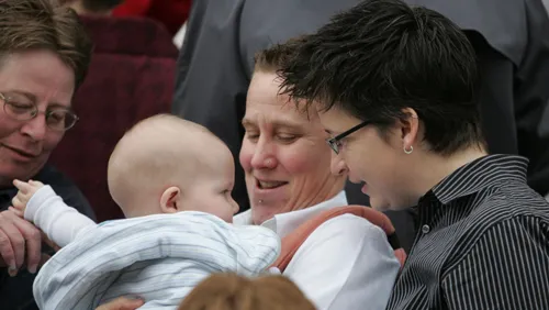 Jennifer Harvey, her fiancée, and their daughter on line for a marriage license.