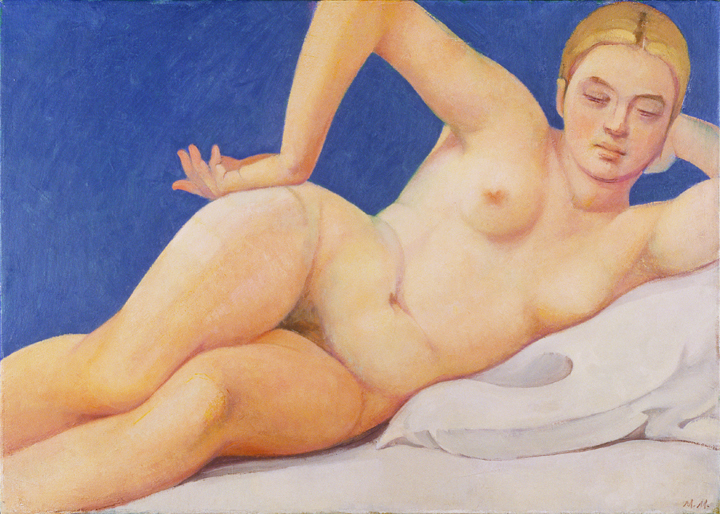 In terms of palette practice, Uglow’s portrait of Marigold could readily be titled “Harmony in Blue and Orange.” The artist suggested as much, in pictorial code, by the pure cobalt of the woman’s dress and that undefined hint—a chair back, perhaps?—of yellow-orange behind her. [The skin tones of the nude above simply required more titanium white than did Marigold. But they included the same mix of pigments: cobalt blue, orange and Naples yellow.]